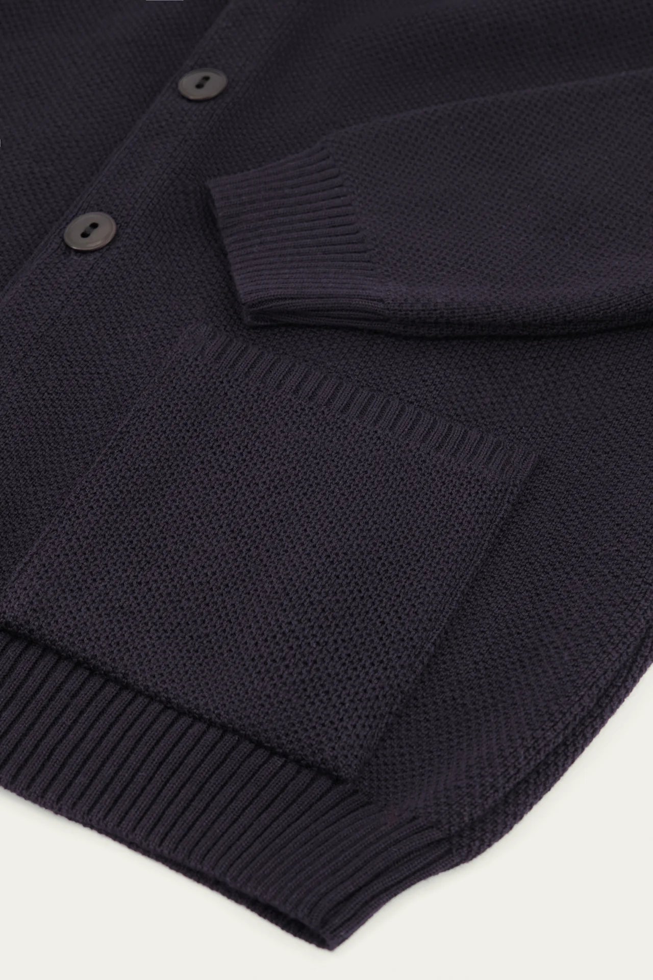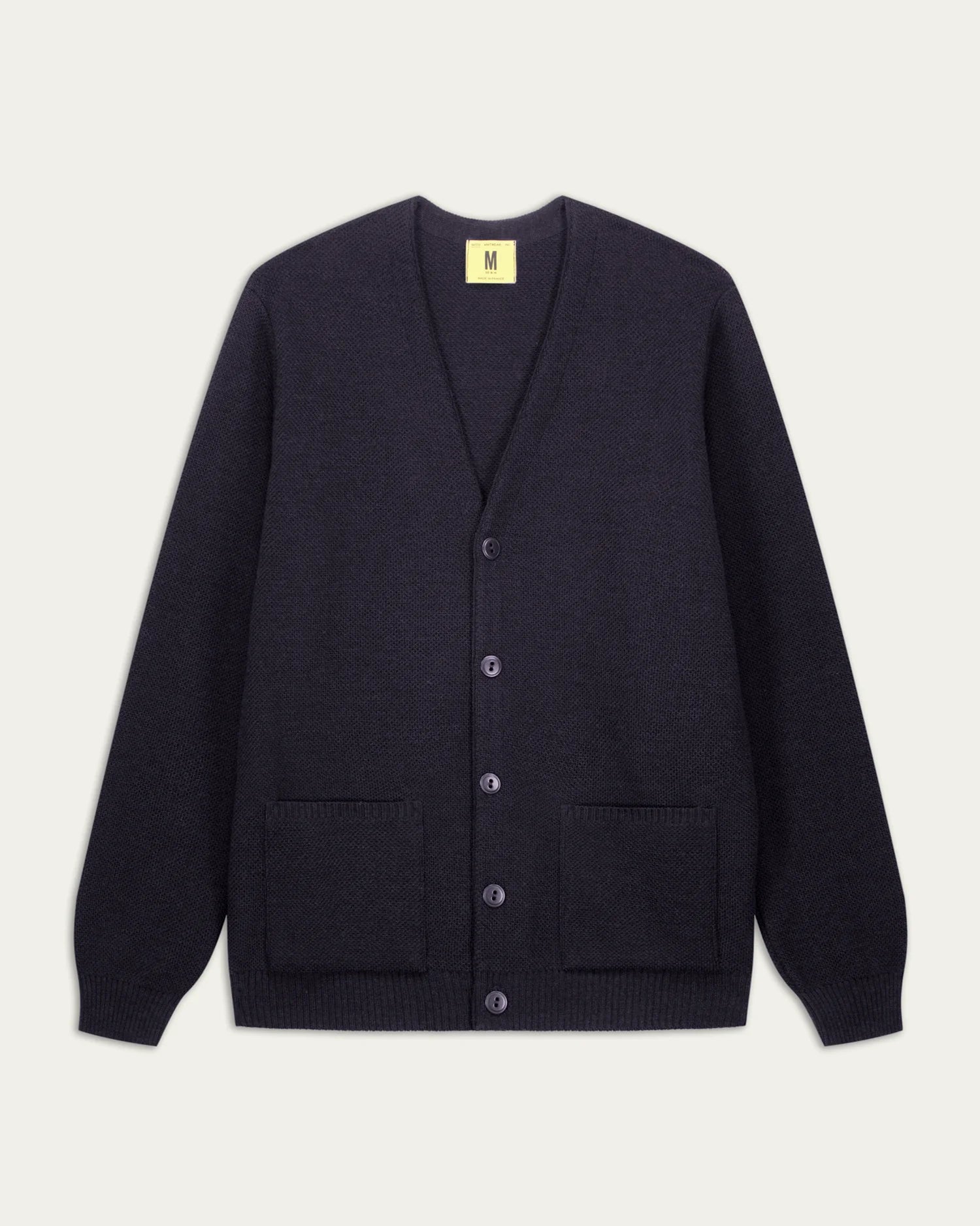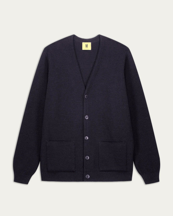 Le cardigan Youri reprend le tricotage et le fil du pull Youri mais en gilet. On retrouve la même maille piquée, le même toucher, les mêmes coloris. Les deux poches sont tricotées dans la même maille et cousues directement sur la pièce. Le col et la boutonnière sont surpiqués par l'intérieur d'une bande tricotée en maille jersey, pour assurer une bonne tenue. Ses 5 boutons en corozo, un matériau naturel issu de la noix d’un palmier, sont fabriqués et teints en France, dans la baie de Somme.